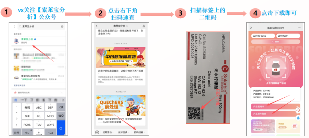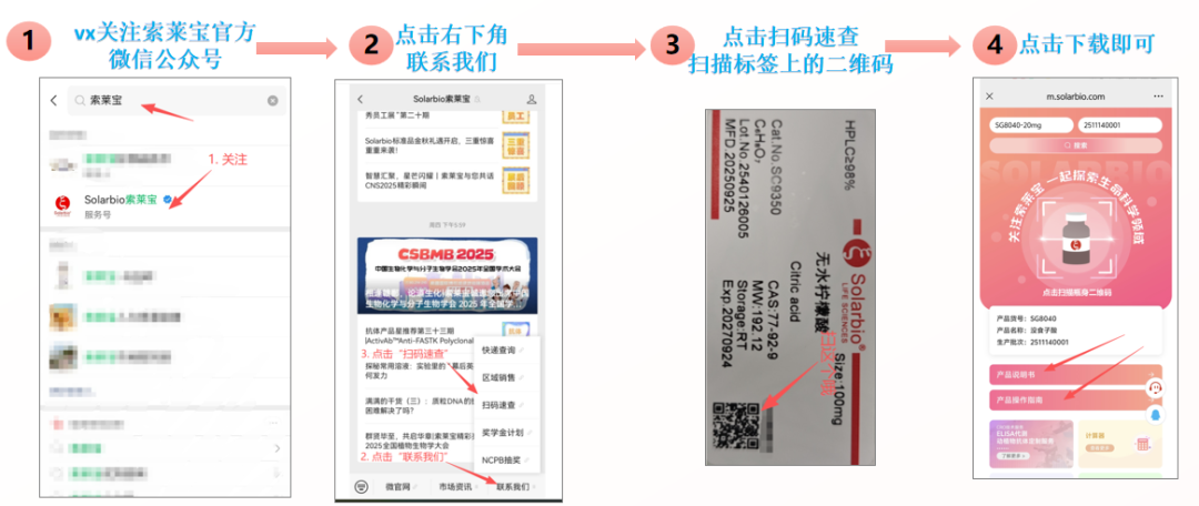 四、服务升级,分析标准品电子说明书上线除了包装,索莱宝分析标准品还上线了电子说明书,让大家获取产品信息更轻松、更便捷。以前翻纸质说明书是不是总觉得麻烦,还担心一不小心就弄丢了?别愁啦,有了电子说明书,这些烦恼统统都能解决!获取分析标准品电子说明书