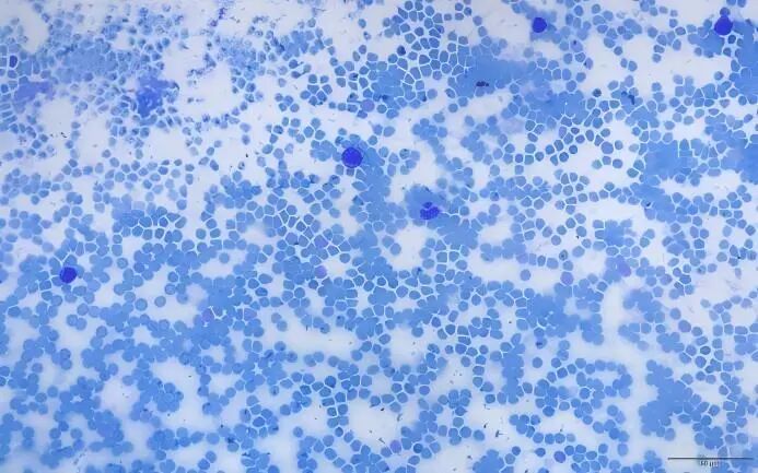结果描述:淋巴细胞和嗜碱性细胞为紫红色,红细胞为蓝色