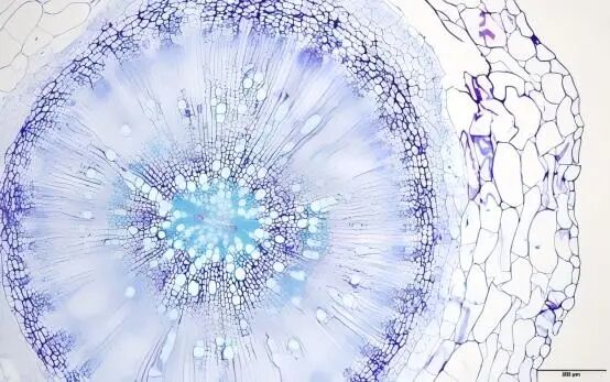 结果描述:中间木质化细胞壁为蓝绿色,非木质化细胞壁为紫蓝色