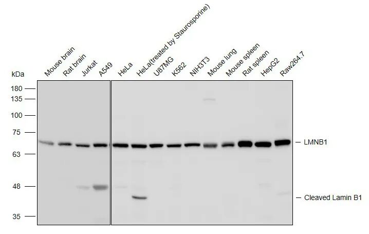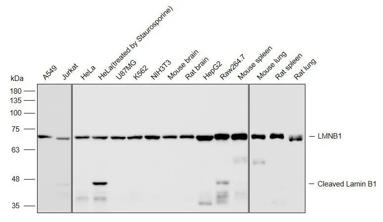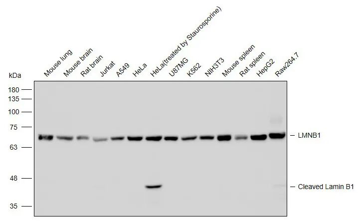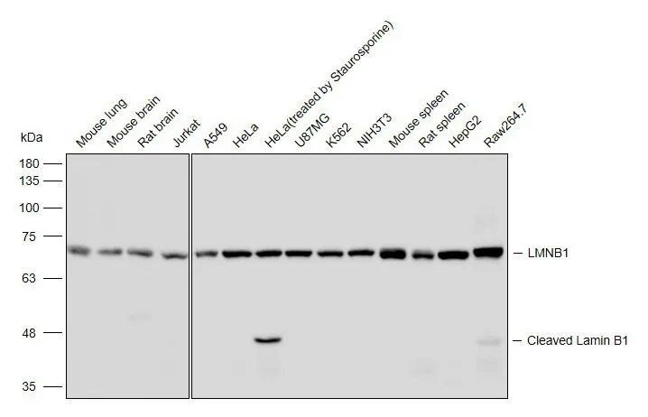 抗体的可靠性在细胞凋亡相关机制研究中得到进一步验证。星形孢菌素(Staurosporine)作为凋亡诱导剂,可激活细胞内Caspase蛋白酶,进而特异性切割LMNB1蛋白,产生约45 kDa的C端片段和约25 kDa的N端片段,这一过程是核纤层解体与凋亡推进的关键标志。使用LMNB1抗体可在蛋白质印迹(WB)中清晰检测到全长LMNB1及其凋亡相关剪切片段。