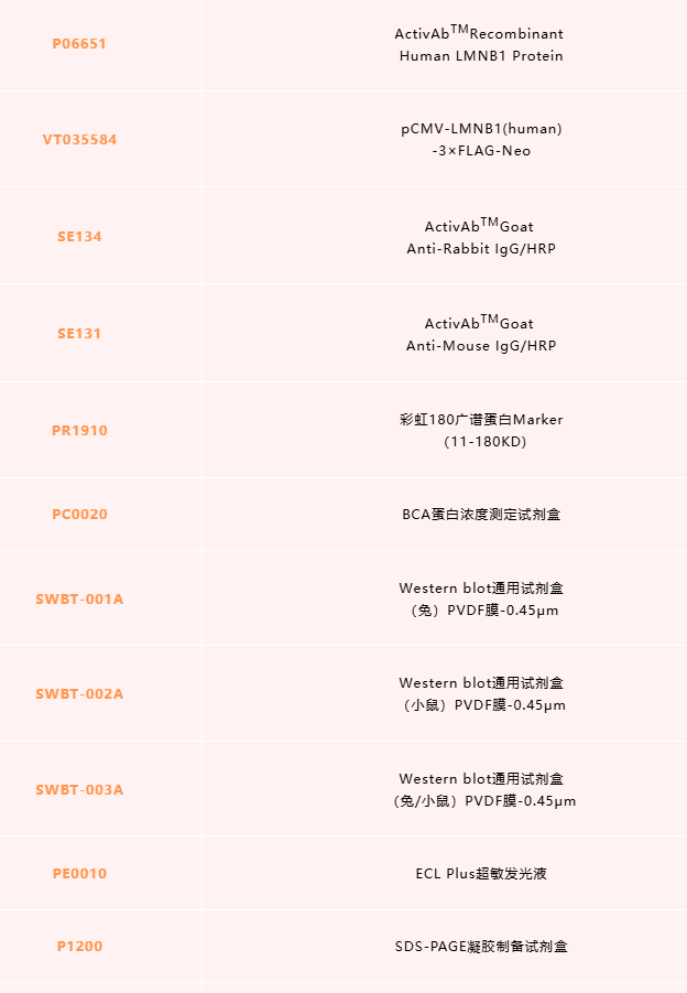 LMNB1蛋白质的标准序列586个氨基酸,理论分子量约66kDa,实际蛋白分子量约70kDa。